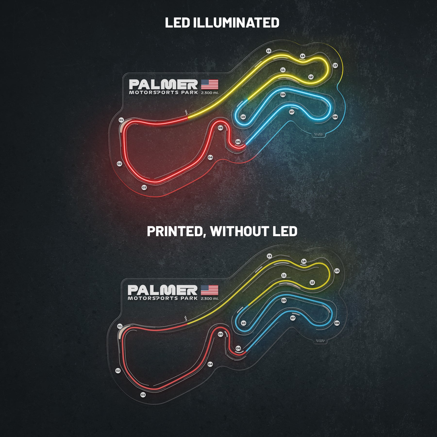 This Palmer Motorsports Park LED Race Track silhouette will add a bright spark of light to any room. Each track features the 3 iconic colors of Formula 1, the race track name alongside the distance and the country it's located in. It's the perfect way to add some color and improve the overall look while catching the attention of anyone, racing enthusiast or not.